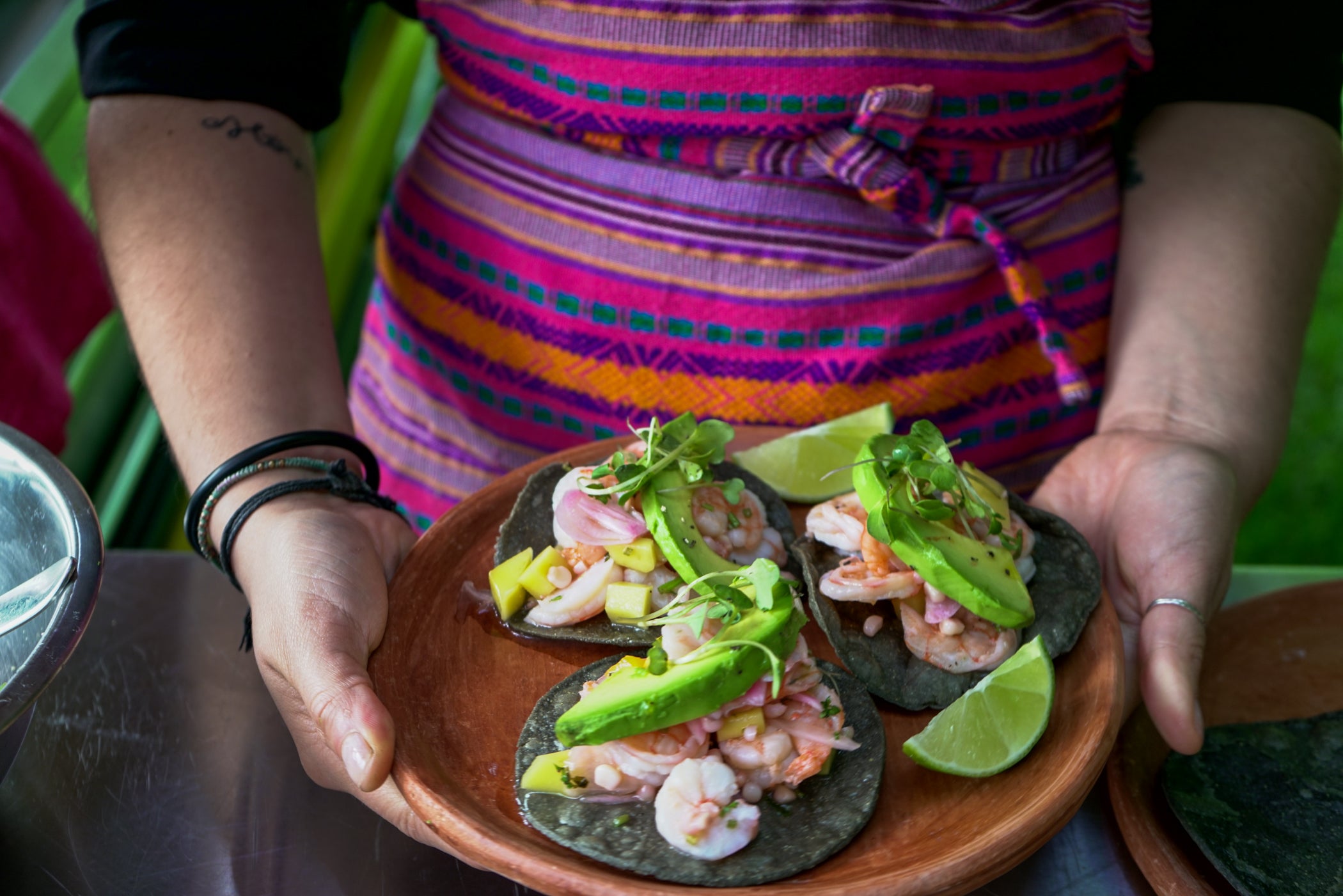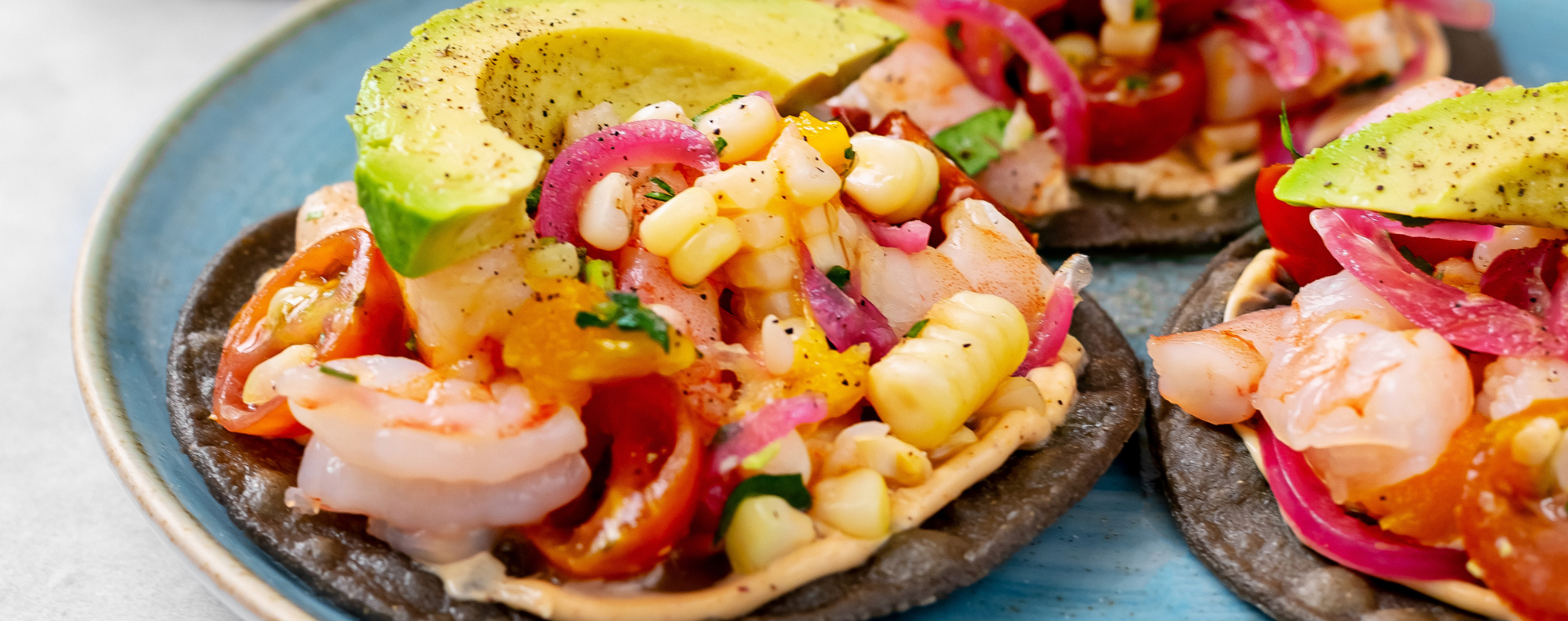Tostada de maíz con ceviche de camarón, aguacate y mayonesa chipotle.