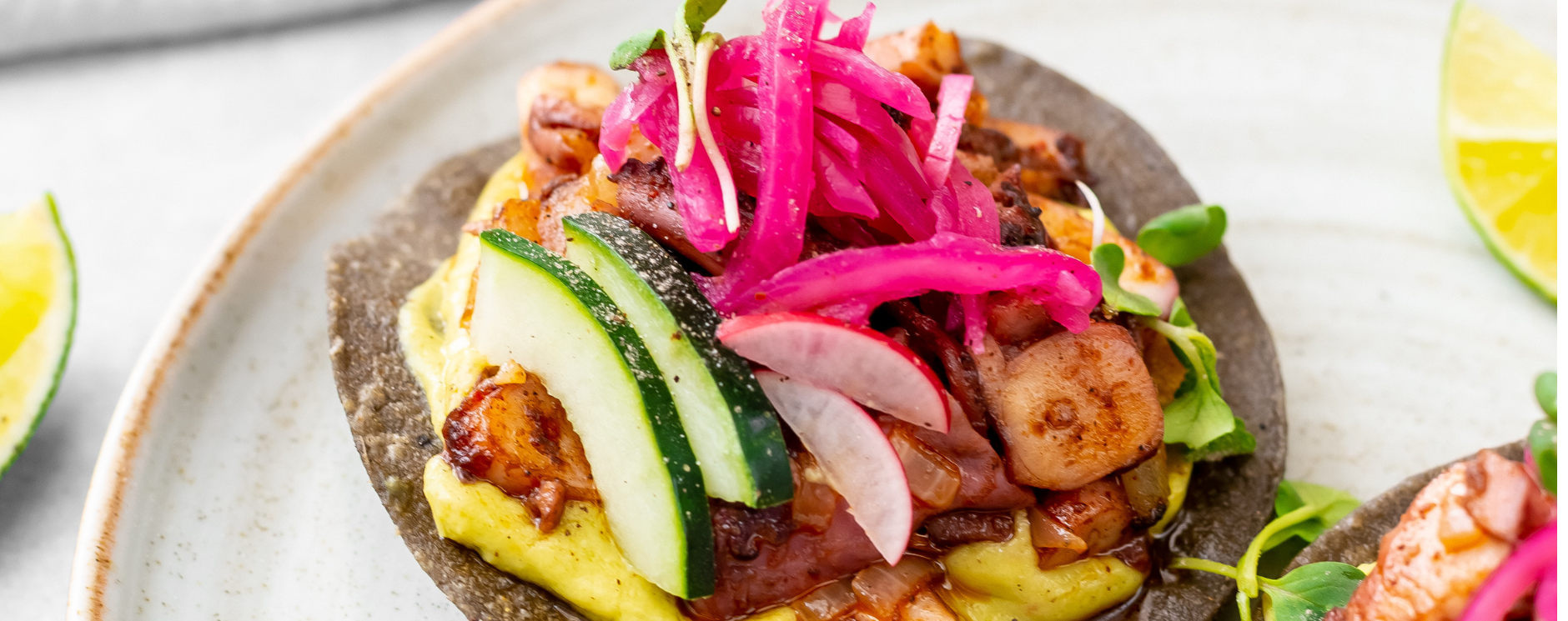 Tostada de maíz negro con pulpo salteado en aceite de chile de árbol con mousse de aguacate.