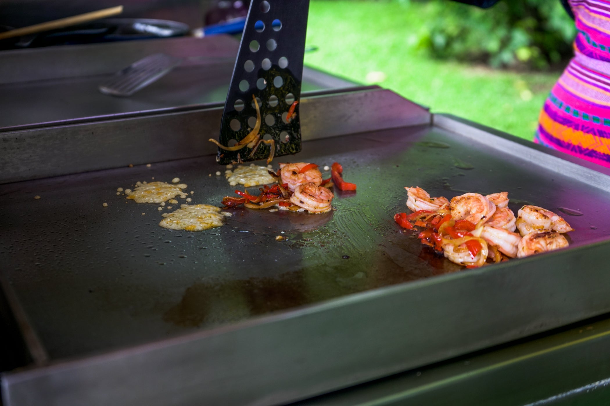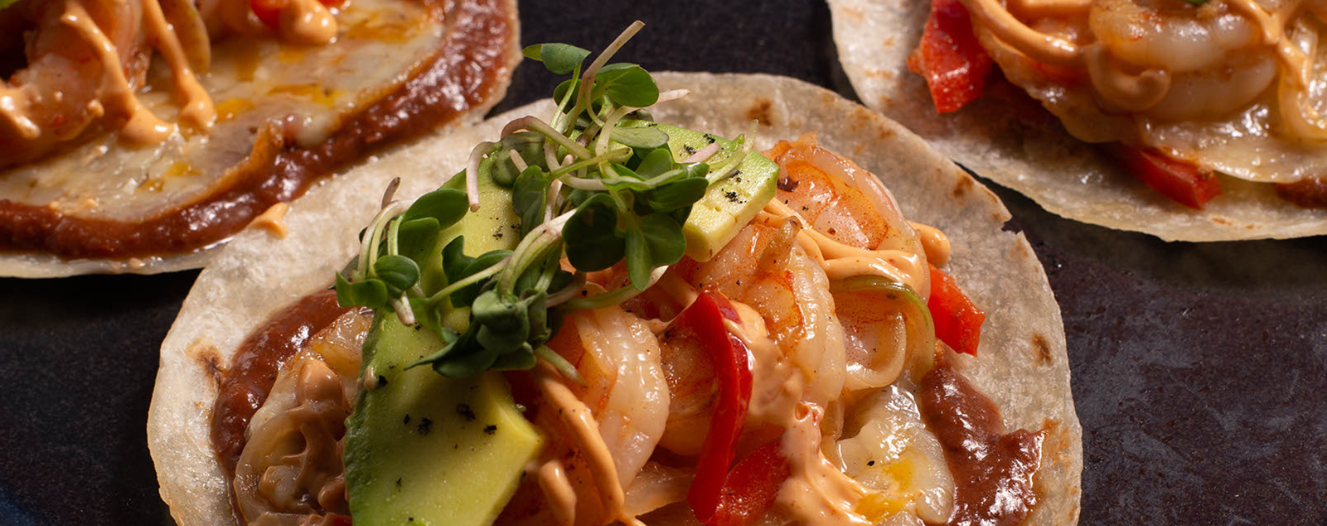 Camarón salteado con tocino, cebolla y chile pimiento sobre frijol rojo y queso. Con mayonesa chipotle y aguacate servidos en tortillas de harina hechas en casa.