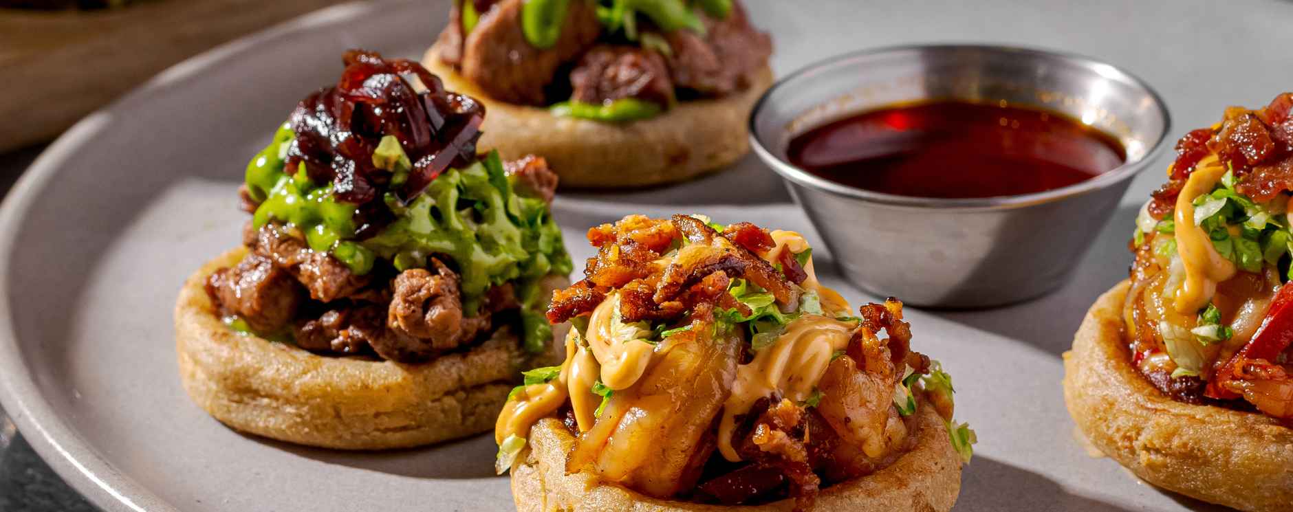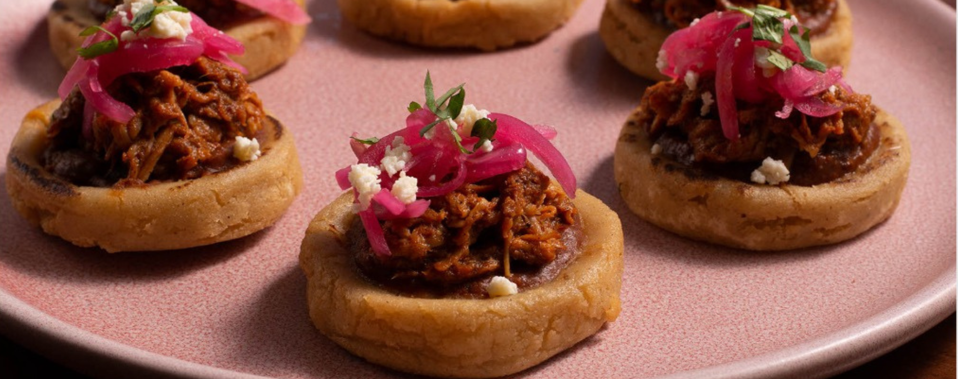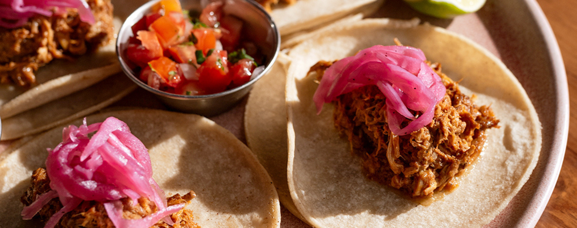 Carne de cerdo deshebrada con nuestra espectacular salsa pibil, con cebolla encurtida, sobre tortilla de maíz.