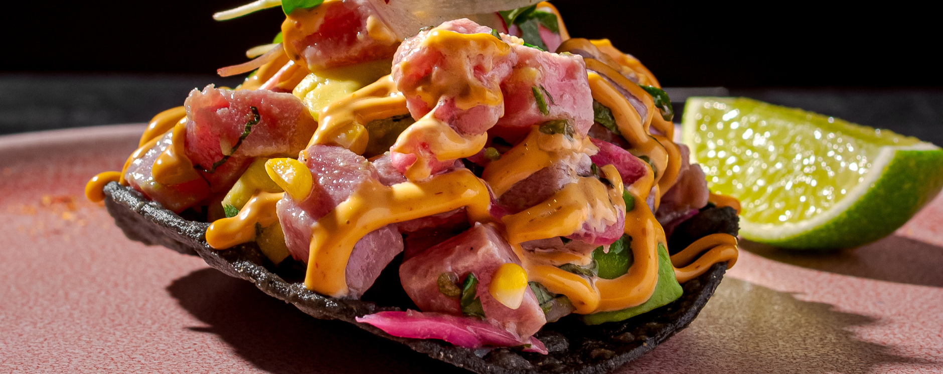 Tostada de maíz negro hechas en casa con atún rojo, mayonesa chipotle, cebolla encurtida, aguacate y elotitos.