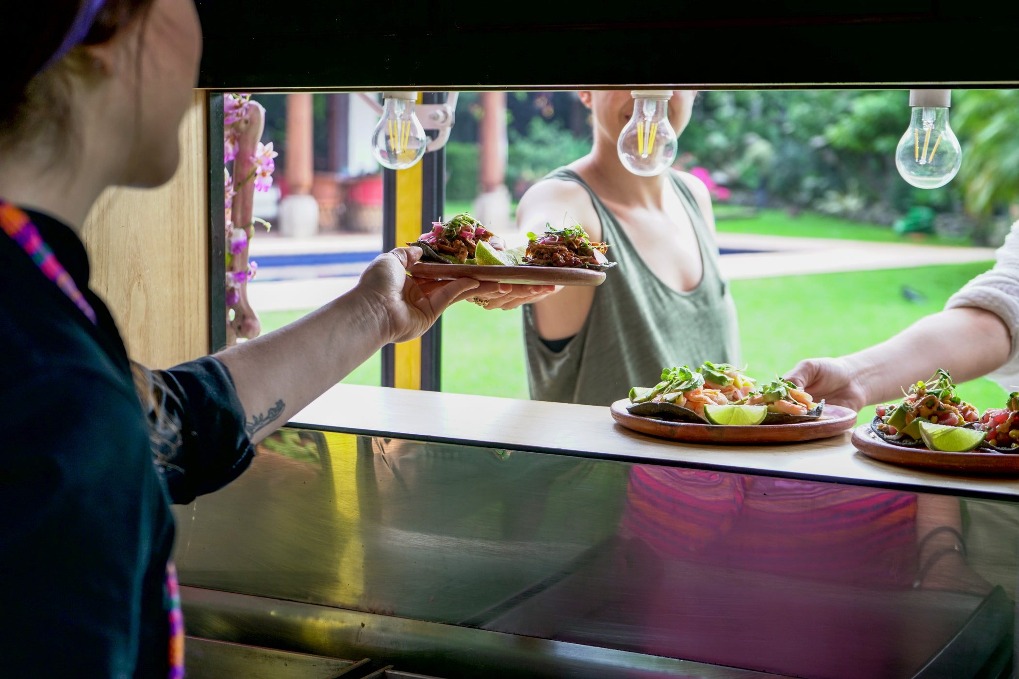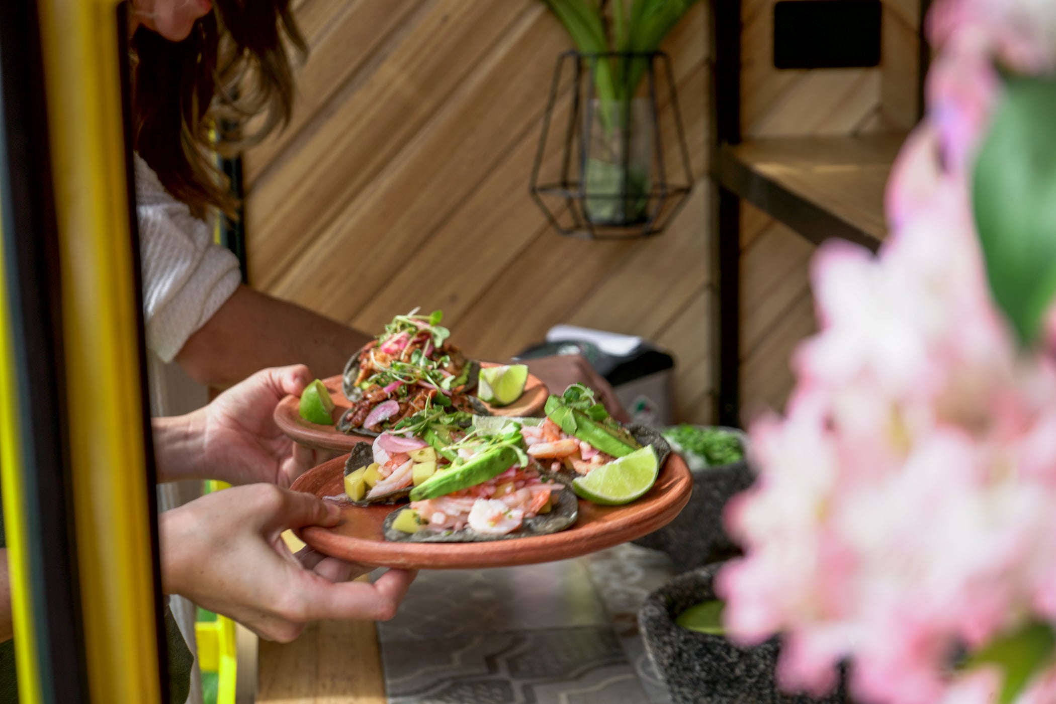 y tiene alas que se abren para ofrecer comida riquísima: tacos muy guapos, entradas preparadas en