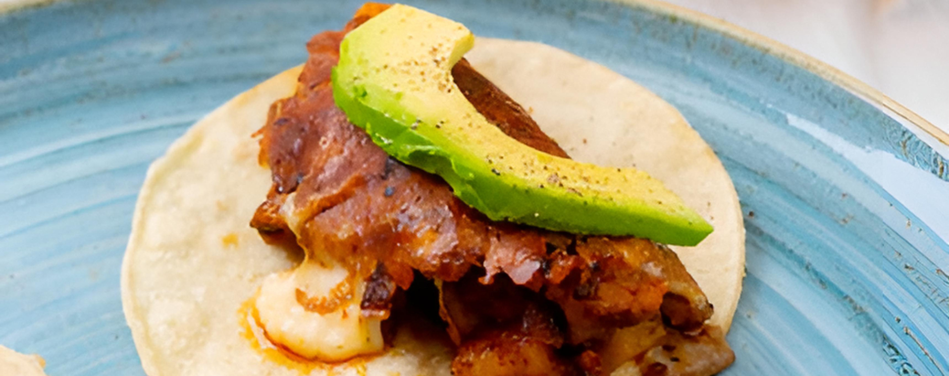 Carne de cerdo adobada al pastor con queso, piña asada y aguacate sobre tortillas de maíz.