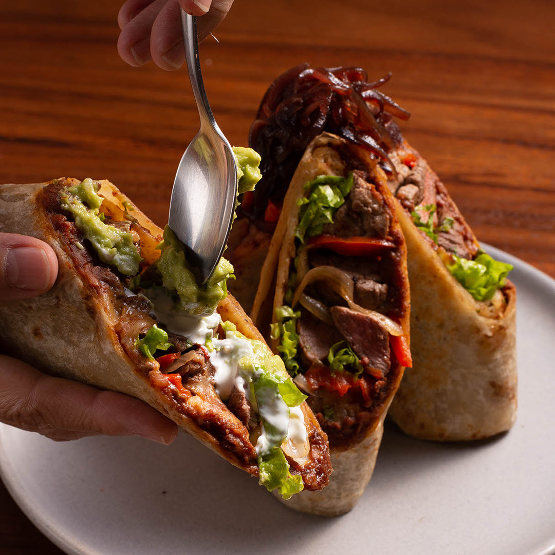Dos tortillas de harina, con cebolla, chile pimiento, suquini, arveja china, lechuga, queso y frijol. Acompañado de guacamole y pico de gallo.