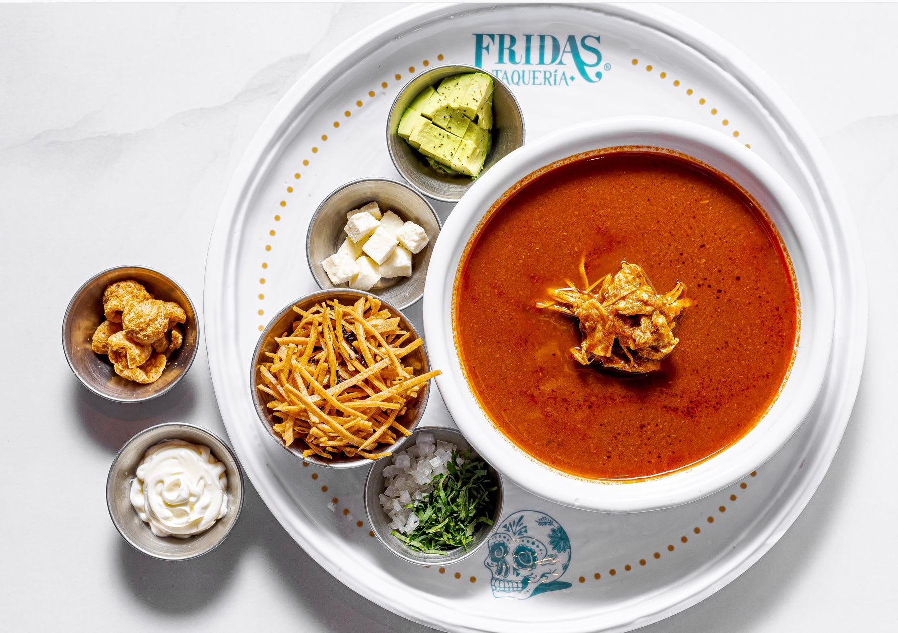 Nuestra tradicional sopa de tortilla con pollo y aguacate. Acompañada de chicharrón, tortilla frita, crema y queso fresco.
