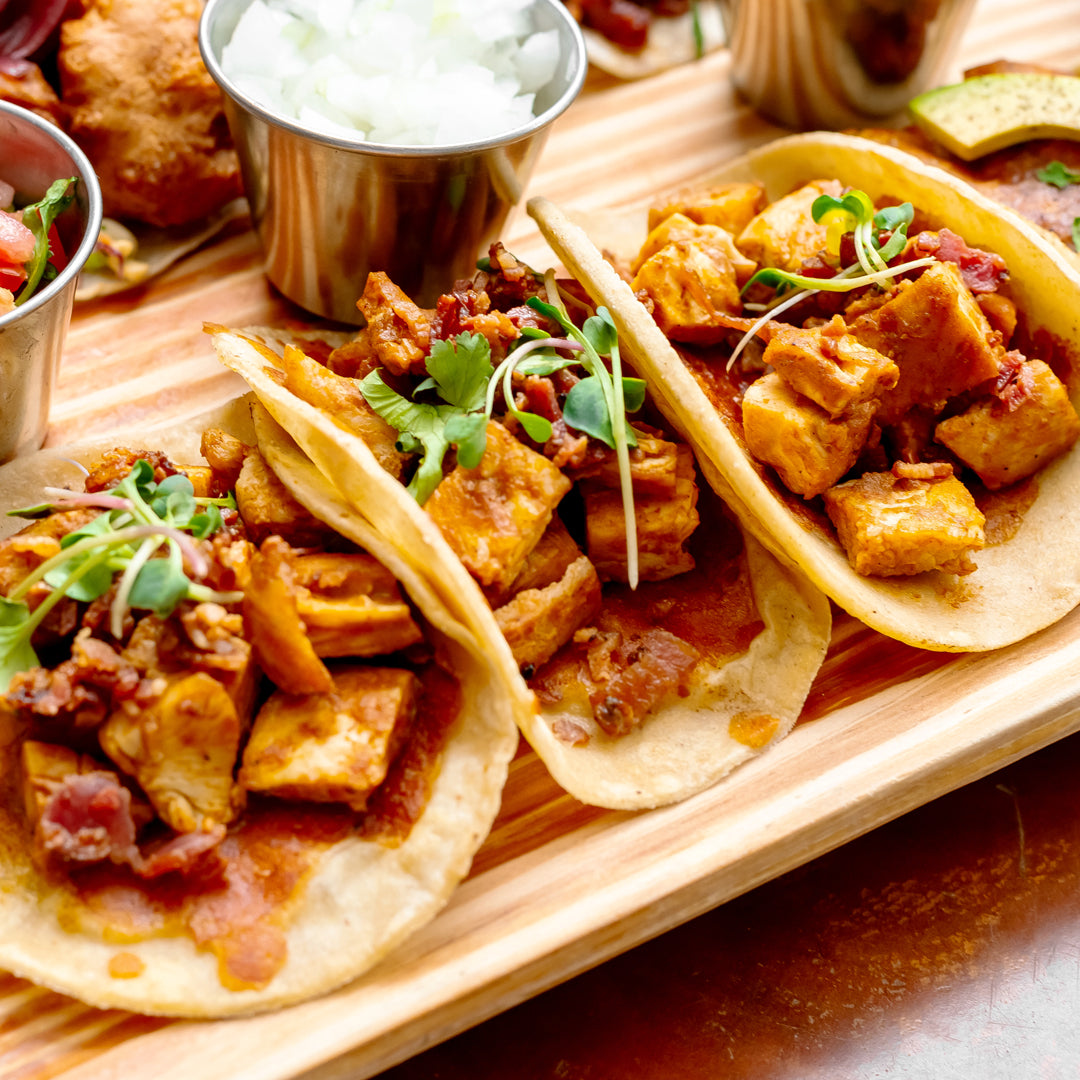 Pechuga de pollo bañada en crema, chipotle, tocino y queso. Servidos en tortilla de maíz.